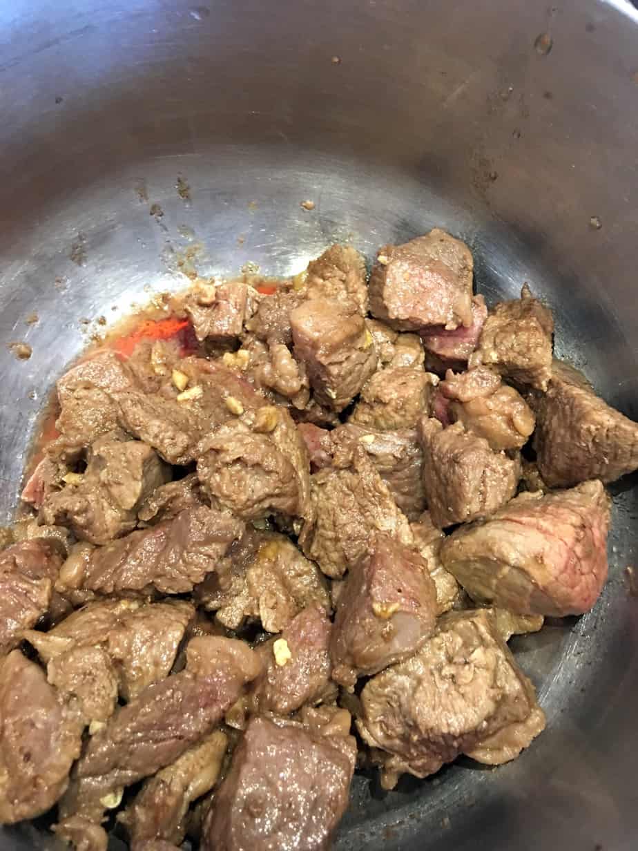 Next add sirloin or stew beef, cut into cubes. Sear a few minutes on each side, until well-browned. Transfer the beef to a bowl and set aside.
