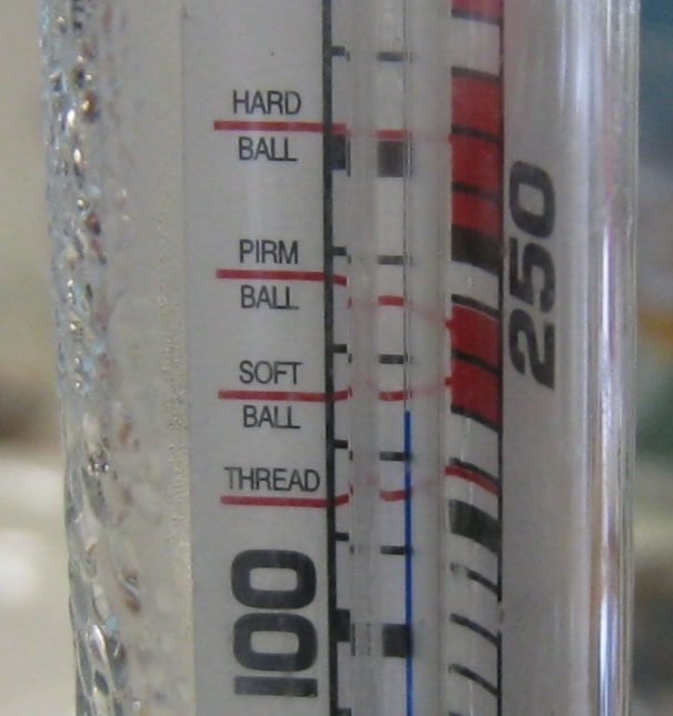 Hard Ball is the next stage, in which you can pick it up and it forms a firm ball between your fingers. If your temperature is at the Hard Ball stage, which is 242-248, you will end up with more of a caramel.