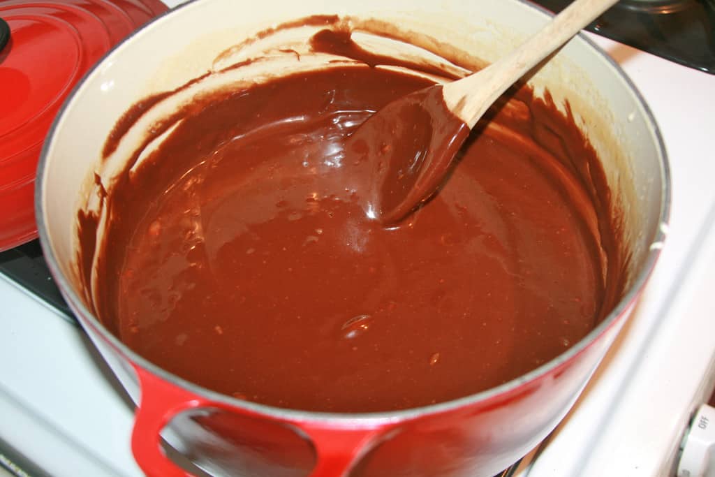 6. Remove from heat, stir in vanilla and chocolate until chocolate is melted.