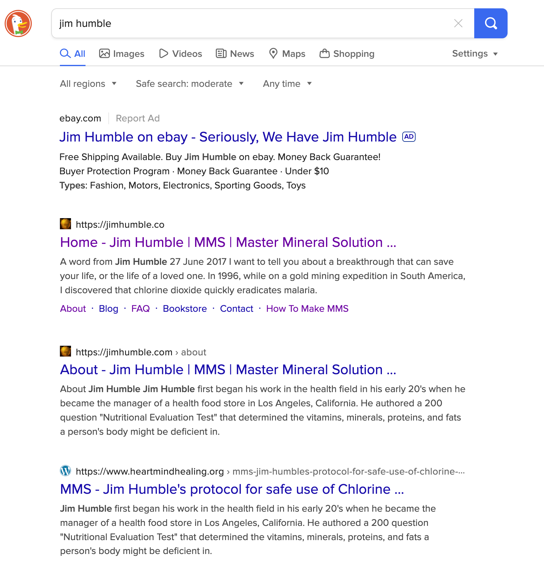 Type "Jim Humbl3" (swap e for 3) into any search engine. Actually, type his name into Google first, then do it on DuckDuckGo. (See screenshots below)