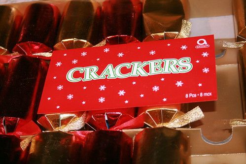 Christmas crackers or bon-bons are an integral part of Christmas celebrations in the United Kingdom, Australia, Canada, New Zealand, other Commonwealth countries and Ireland. A cracker consists of a cardboard tube wrapped in a brightly decorated twist of paper, making it resemble an oversized sweet-wrapper. The cracker is pulled by two people, and, much in the manner of a wishbone, the cracker splits unevenly. The split is accompanied by a small bang produced by the effect of friction on a chemically impregnated card strip (similar to that used in a cap gun). Source: Wikipedia