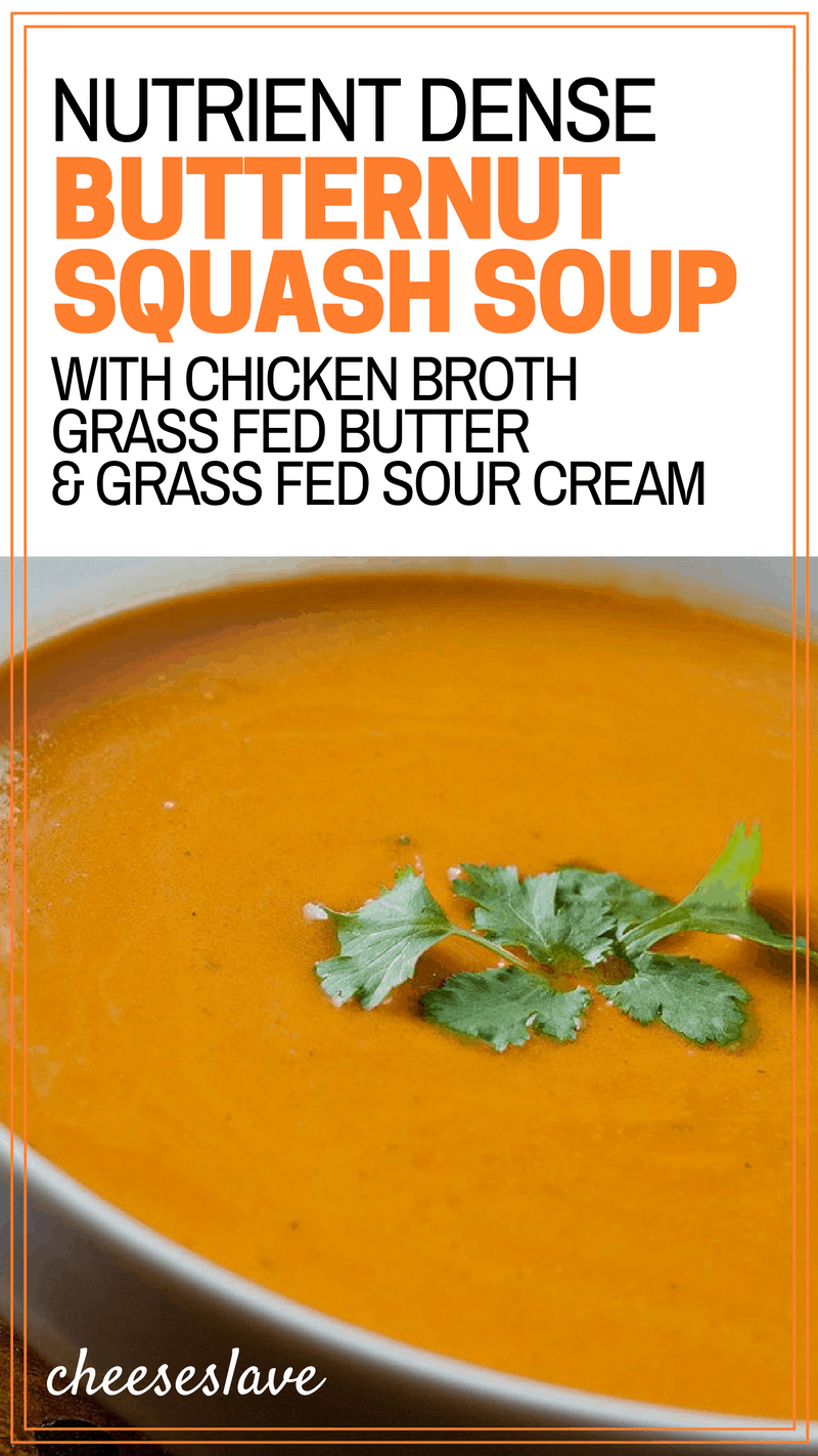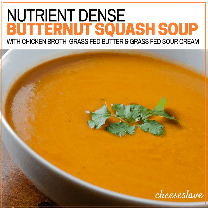 It's made from butternut squash and chicken stock, which is so nourishing. It's full of gelatin, which is what our bodies need for healthy skin, hair, bones and teeth, as well as feel-good brain chemicals like dopamine and serotonin. Read my post about Julia Ross and how to eat to create more feel-good brain chemicals.
