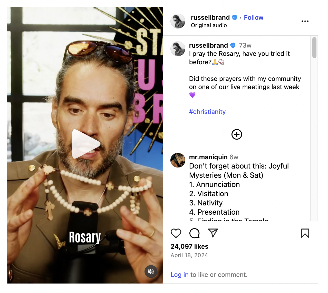 Russell Brand's wife is also a devout Catholic according to friends of friends who know her. He has been praying the rosary on social media.