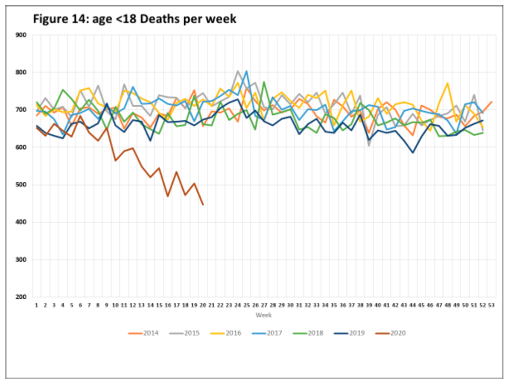 “…the pandemic experience has brought on a surprising effect on this expected death rate among children. Starting in early March, expected deaths began a sharp decline, from an expected level of around 700 deaths per week to well under 500 by mid-April and throughout May. (1) As untimely deaths spiked among the elderly in Manhattan nursing homes and in similar settings all over the country, something mysterious was saving the lives of children. As springtime in America came along with massive disruptions in family life amid near-universal lockdowns, roughly 30% fewer children died.”