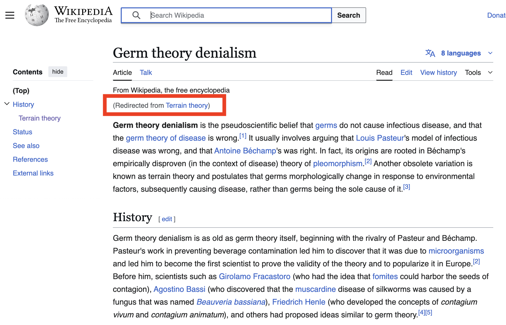 All you have to do is search for "Terrain Theory" on Wikipedia. It redirects you to a page called "Germ Theory Denialism."