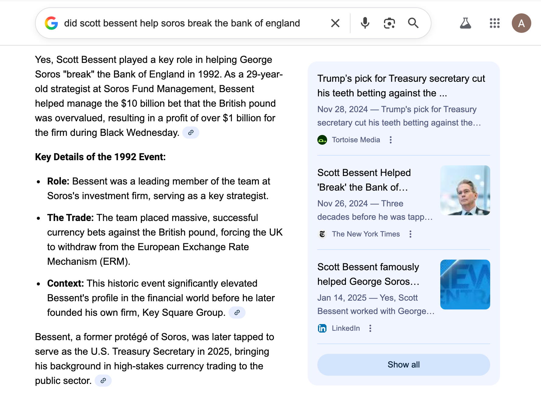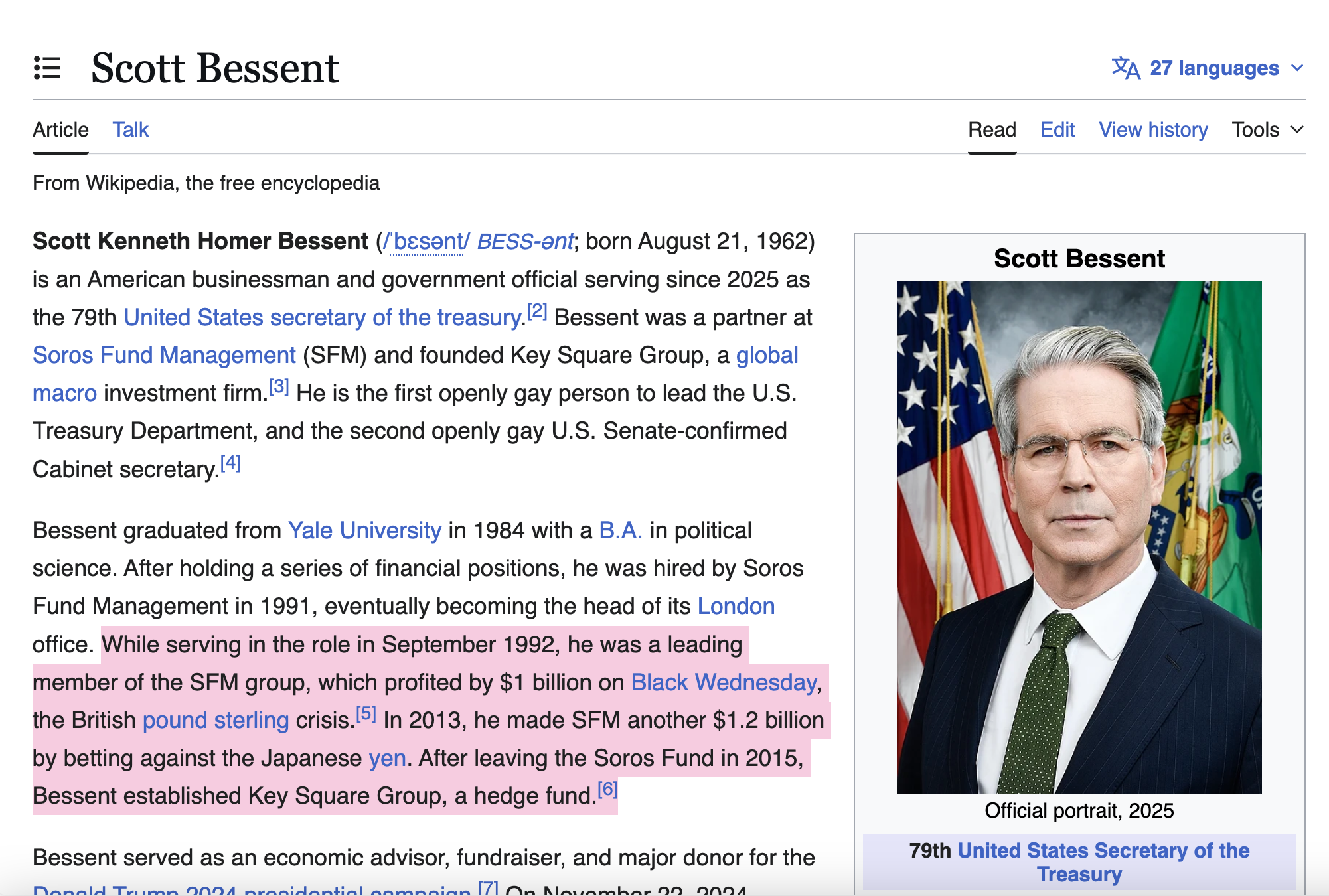 Bessent is a protégé of George Soros who helped him break the Bank of England in the early '90s.
