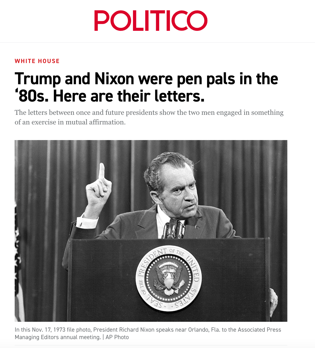 It's important to note that Richard Nixon and Donald Trump were pen pals. If you do a little digging on Nixon, you'll learn some very important things. Nixon spoke out against a certain group of people and they punished him for it. (Source: Politico)