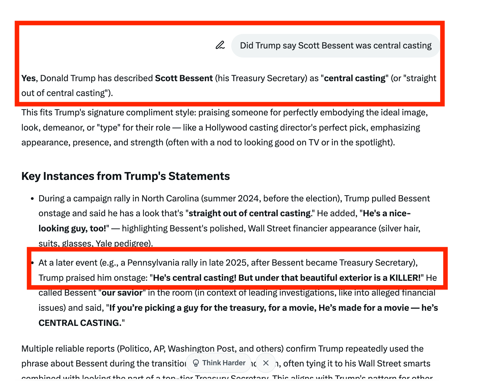 Trump also called Scott Bessent, the current US Secretary of the Treasury "central casting."