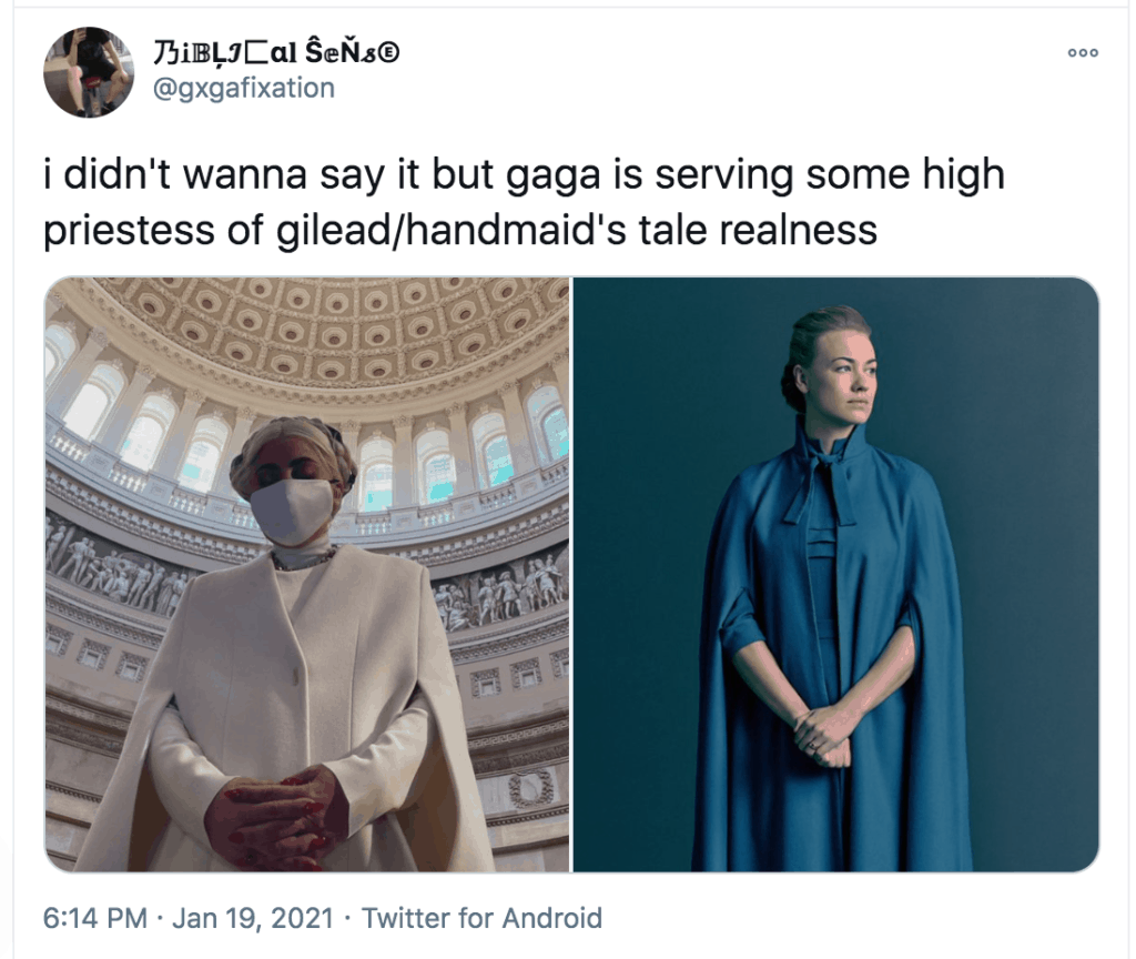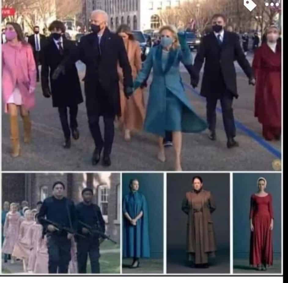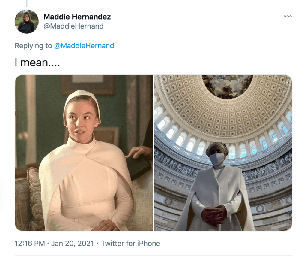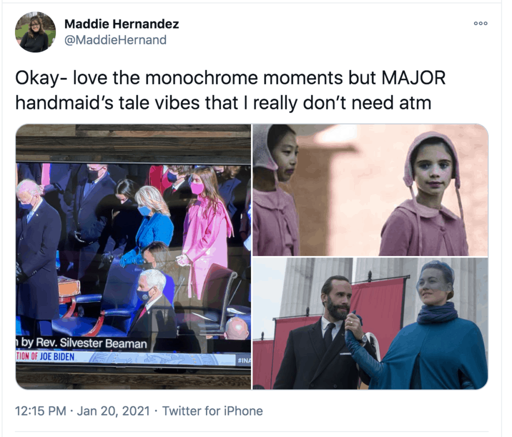 People also compared the inauguration outfits to the costumes from The Handmaid’s Tale.
