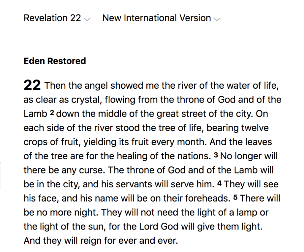 Funny because that’s the name of the last chapter of The Book of Revelation: Eden Restored.
