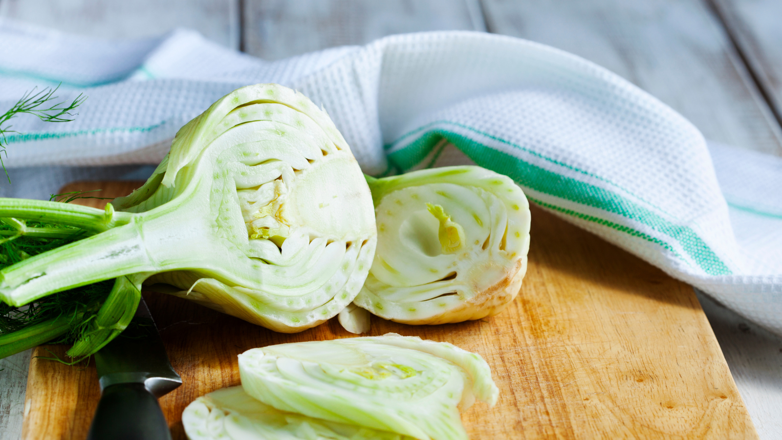 11. Rinse and dry the fennel (or lettuce). If using fennel, cut off the stalks close to the bulb — discard stalks.