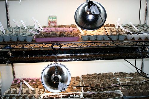 I got some stainless steel shelves from the restaurant supply store (I figure I’ll use them in the kitchen or pantry later). I’m using shop lights with fluorescent bulbs and the lamps on the sides are for warmth. And I have everything hooked up to a timer so they get light 14 hours per day.