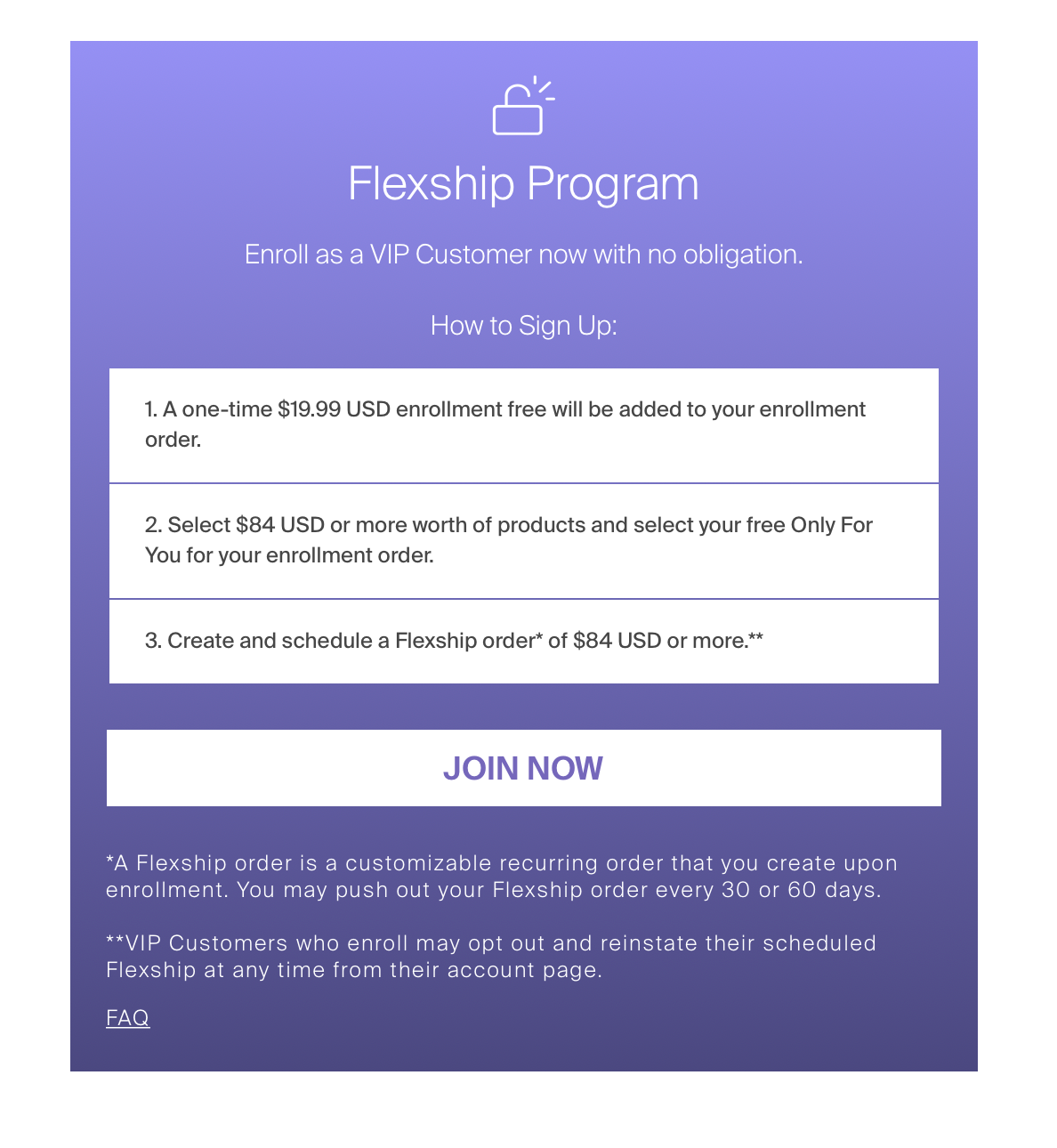 You do have to pay a one-time $20 enrollment fee, but you only have to order TWO more times in your entire life as a VIP. That is your only obligation. You will enroll in the Flexship program, but you can push it out for 2 months. You NEVER need to make a purchase unless you want to, and you're only required to make 3 Flexship purchases ever to stay in the program.