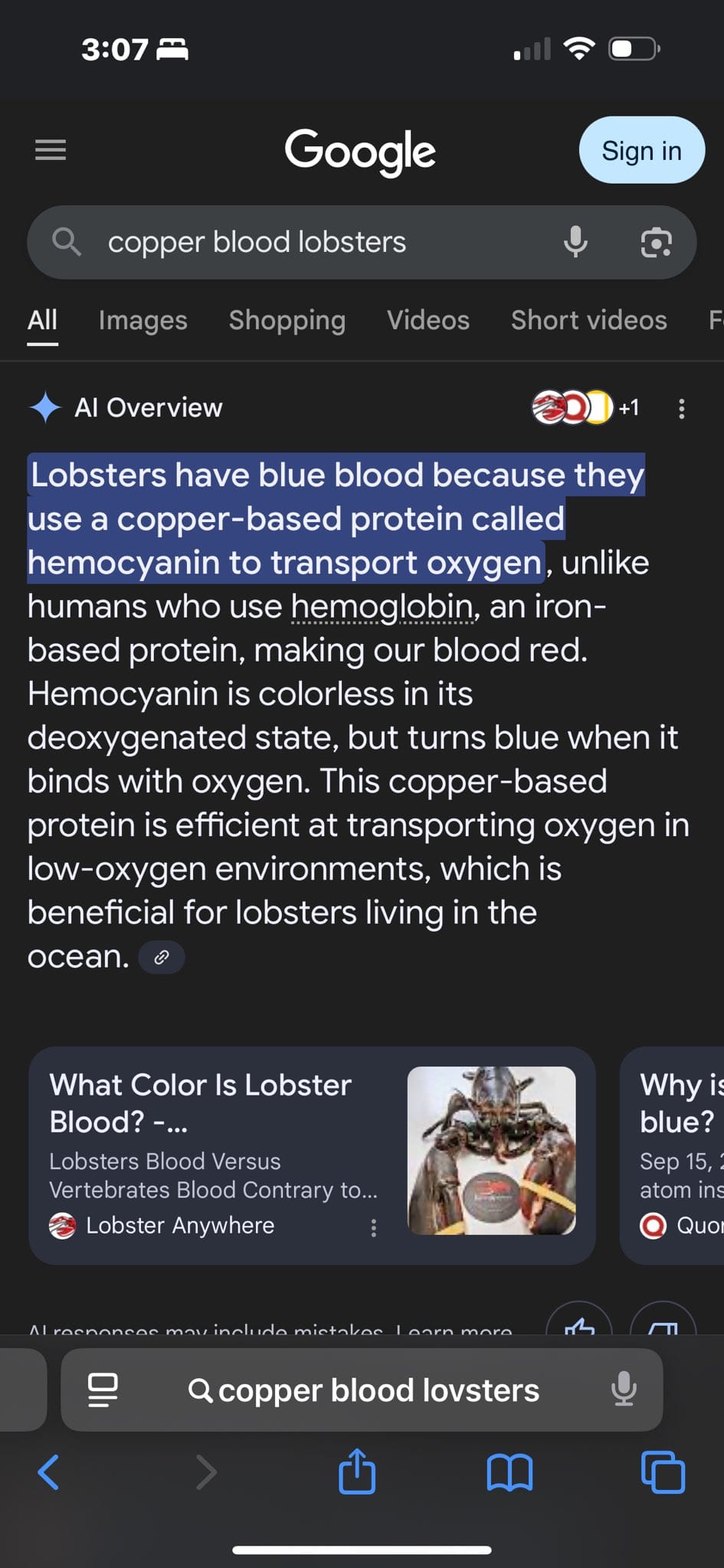 Lobsters and other creatures with copper-based blood have much longer life spans and are able to regenerate limbs.