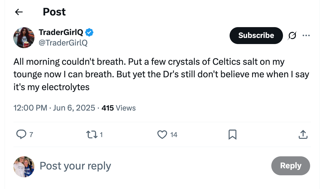 As I was getting ready to publish this post, my friend TraderGirlQ posted this on X – she said she was noticing that when she puts salt on her tongue, it helps her breathe:
