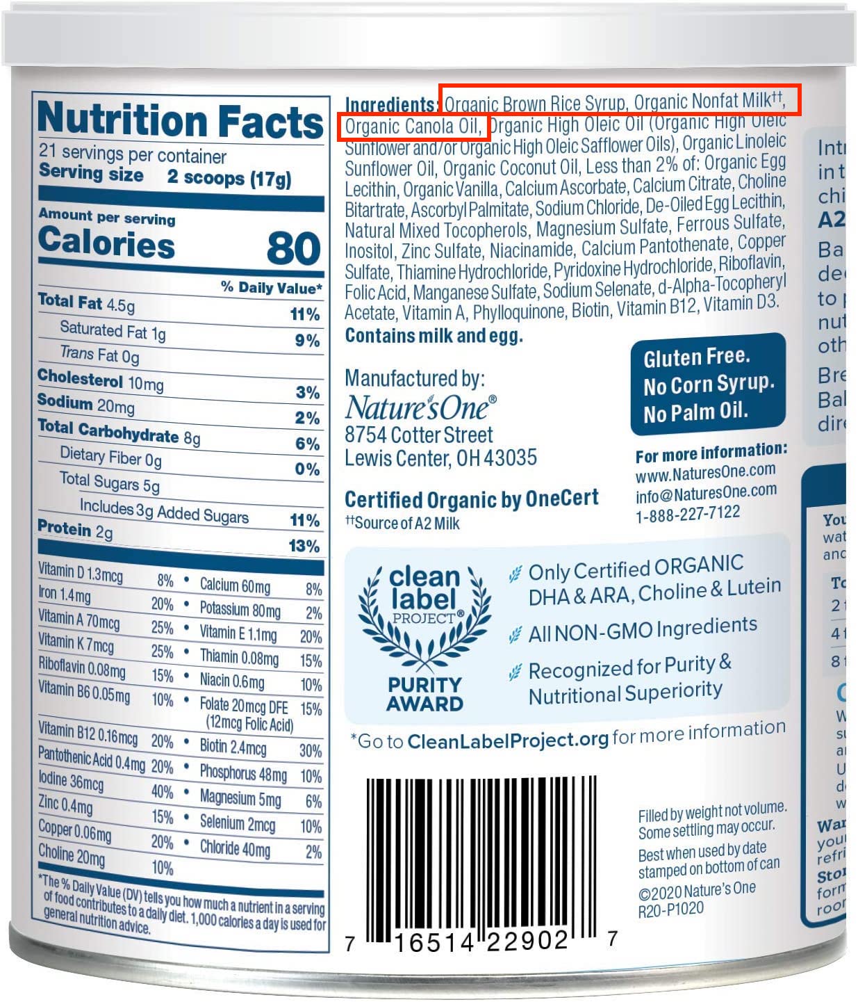 This first one below is an organic, supposedly healthy brand of baby formula. The number one ingredient is basically sugar: brown rice syrup. The number two ingredient is nonfat milk. And the third ingredient is canola oil, which is not good for you. Throw this one in the trash.