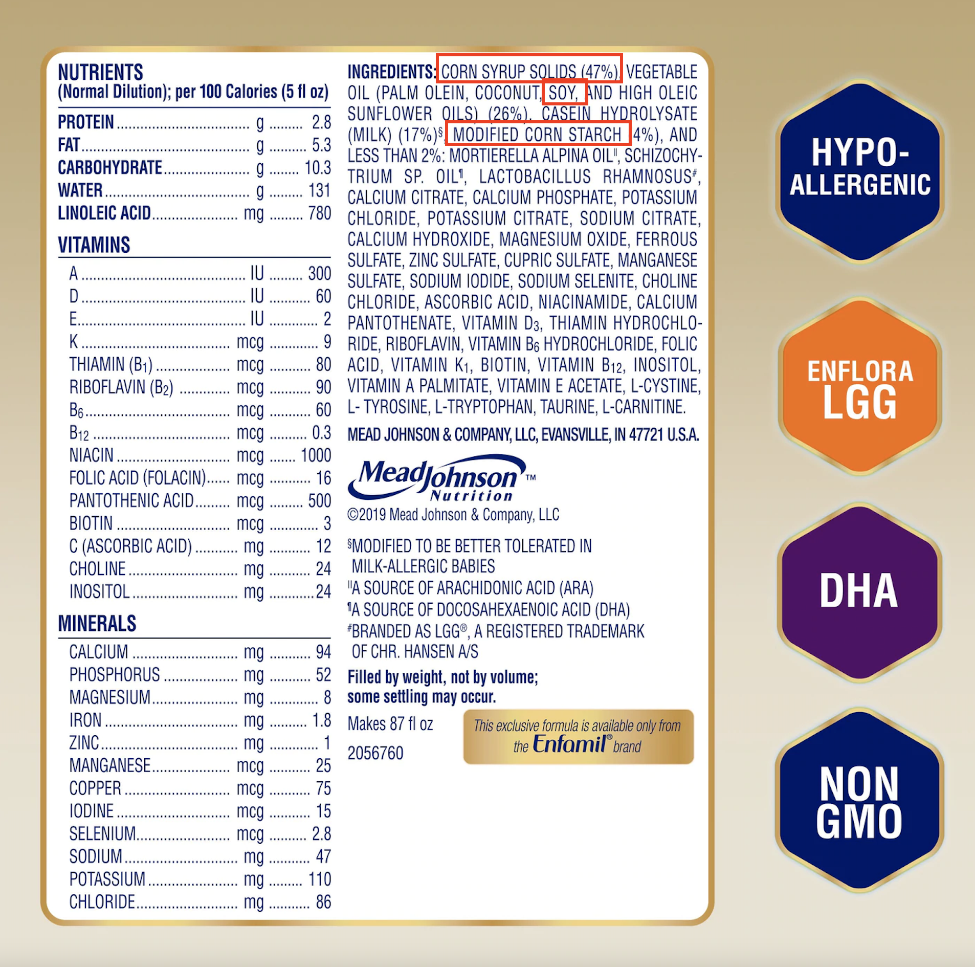 Next we have a non-dairy brand of baby formula made by Enfamil, which is frankly horrifying. Almost 50% corn syrup solids.