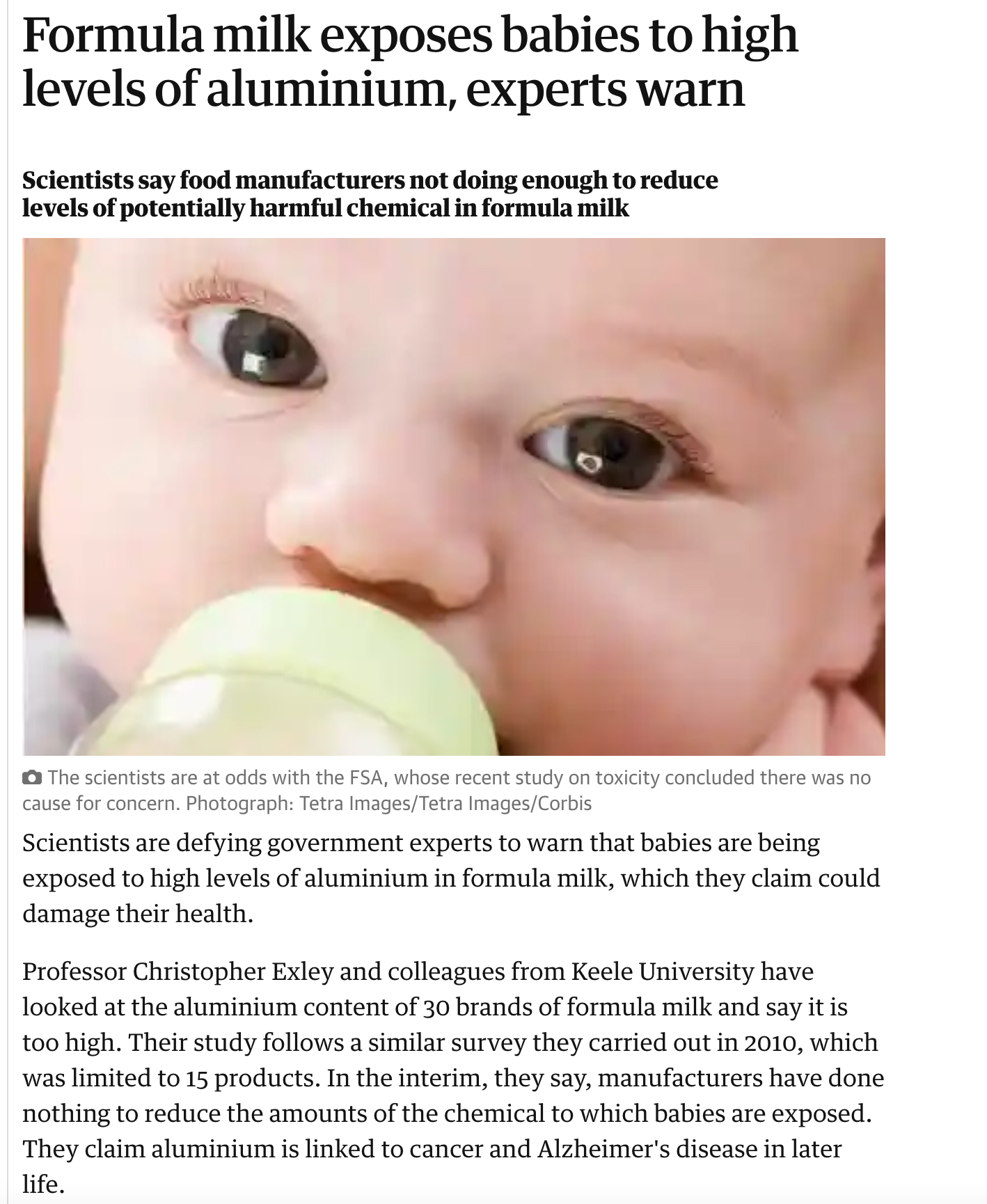In a recent study, Dr. Christopher Exley and his colleagues analyzed dozens of different brands of baby formula and found that they all had high levels of aluminum, which causes cancer and Alzheimer's disease. (Source)