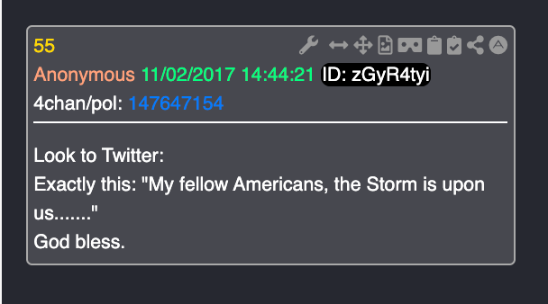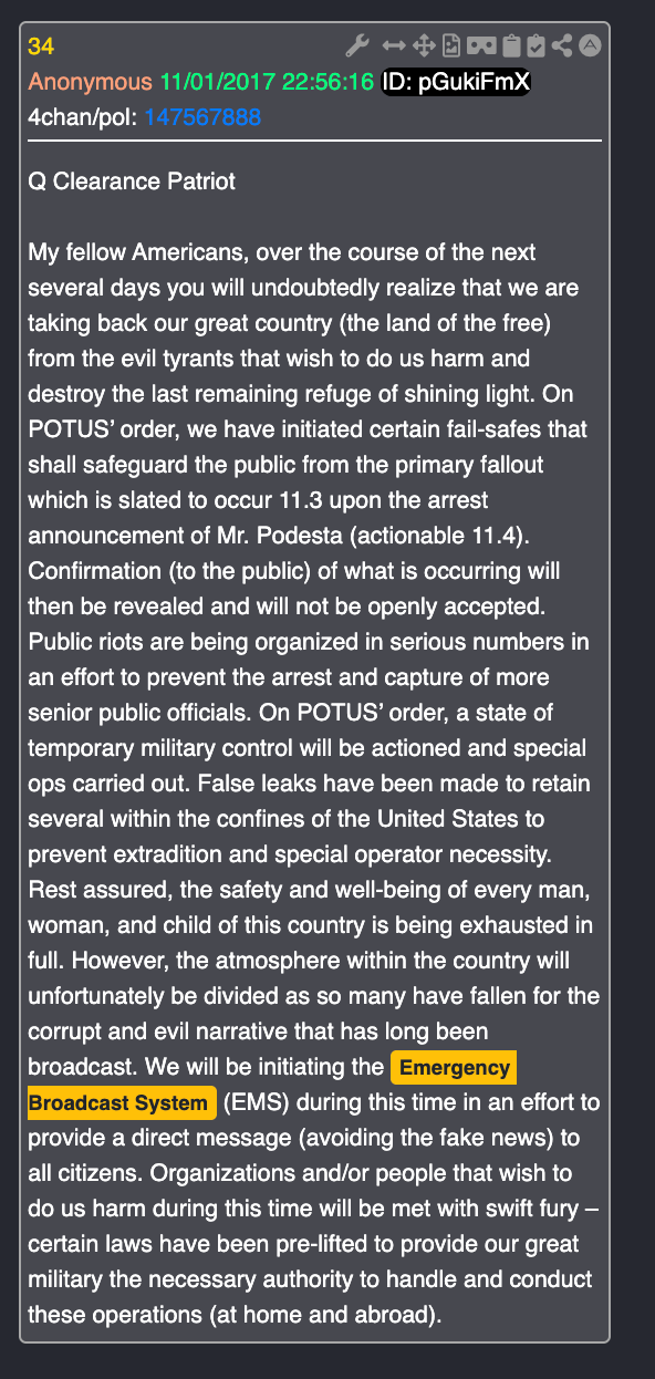 And Q told us to look to Twitter for the announcement, "My fellow Americans, the storm is upon us."