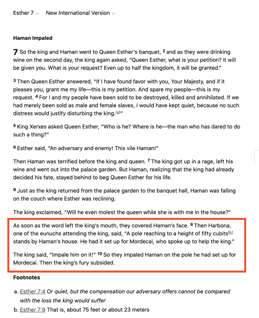 So they impaled Haman on the pole he had set up for Mordecai. Then the king’s fury subsided.Esther 7:10