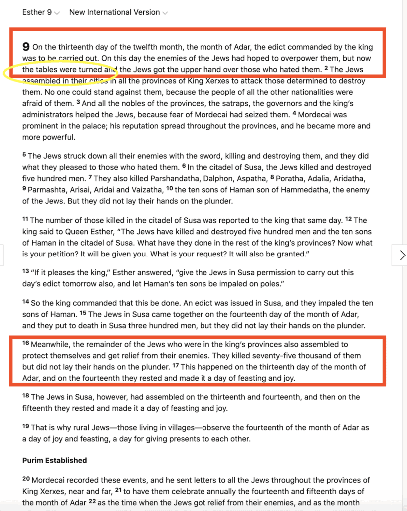 On the thirteenth day of the twelfth month, the month of Adar, the edict commanded by the king was to be carried out. On this day the enemies of the Jews had hoped to overpower them, but now the tables were turned and the Jews got the upper hand over those who hated them. ESTHER 9:1