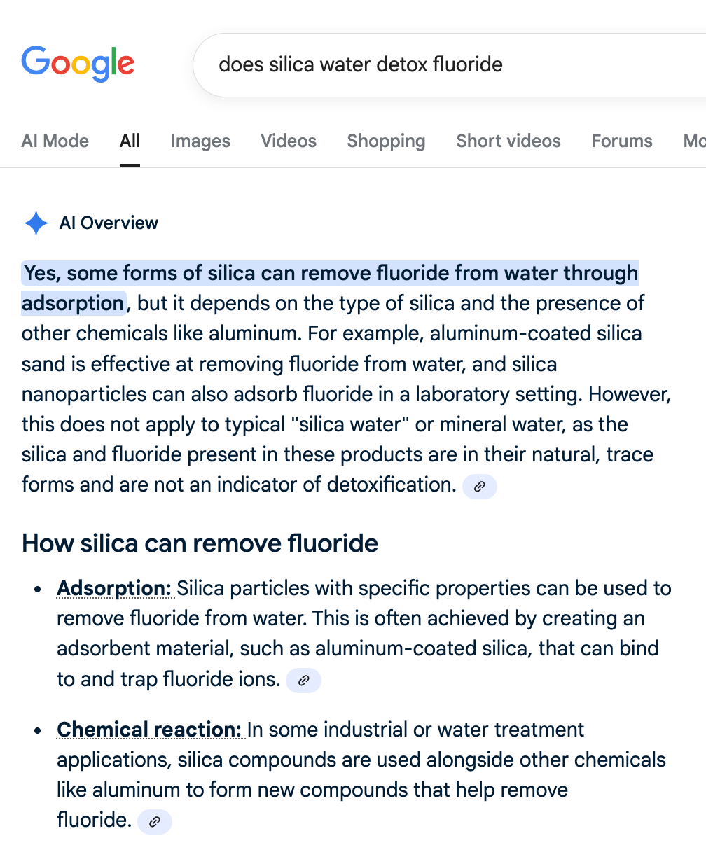 Silica binds and traps fluoride ions and remove them from the body. Silica water is the easiest way to detox fluoride.