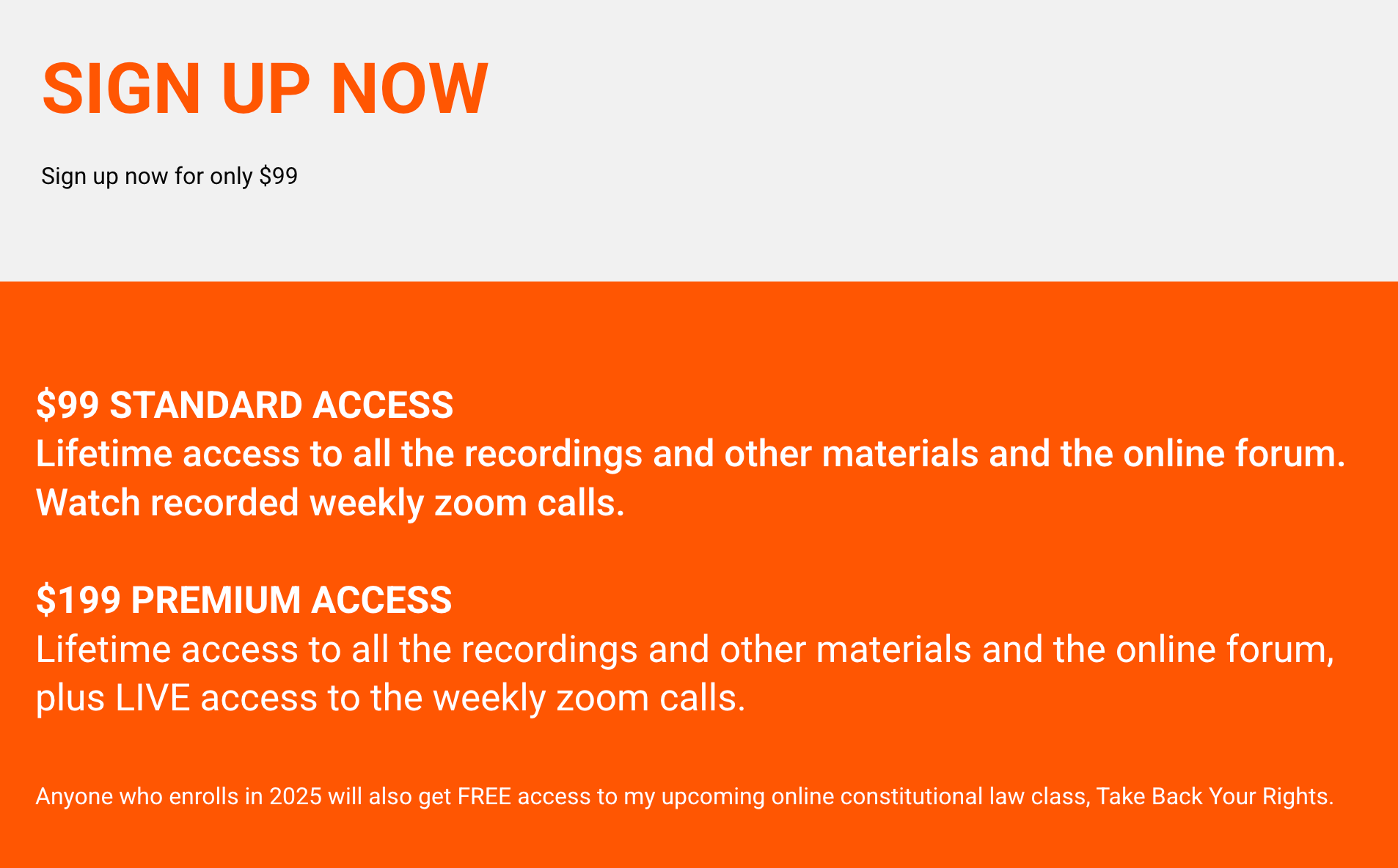 When you sign up now, you will also get FREE access to my upcoming online constitutional law class, Take Back Your Rights. More on that soon...