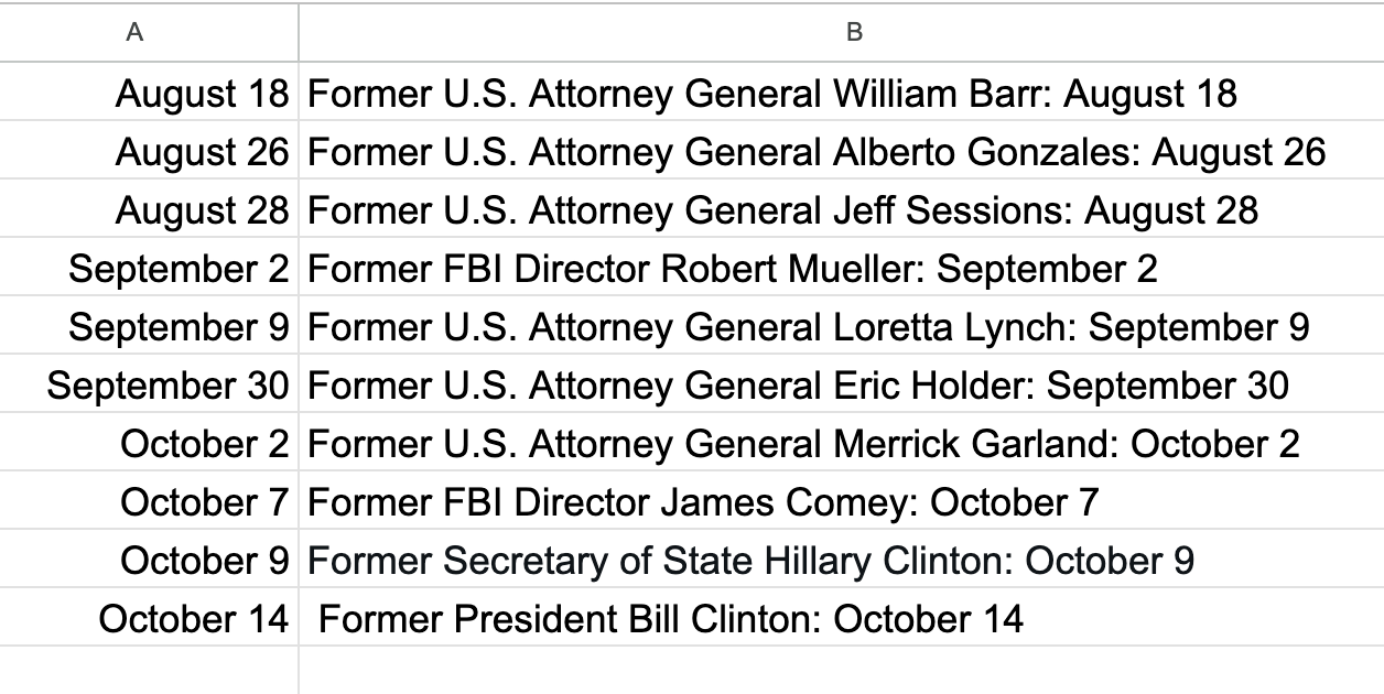 The list of subpoenaed individuals includes former Attorney General Bill Barr, with his deposition scheduled for next week, followed by others in the coming weeks, running through October.