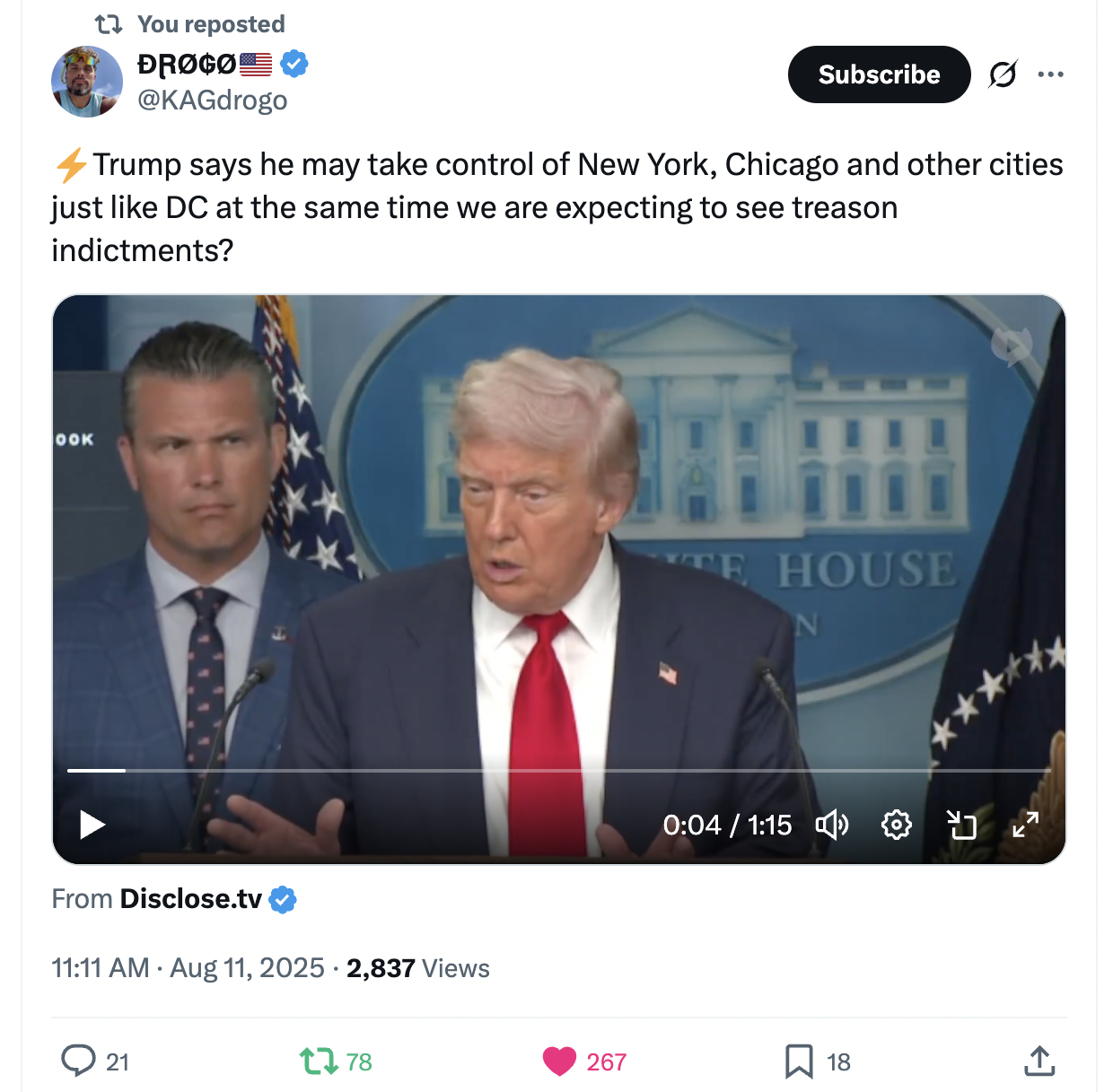 Trump also said he may also take control of New York, Chicago and other cities just like DC.