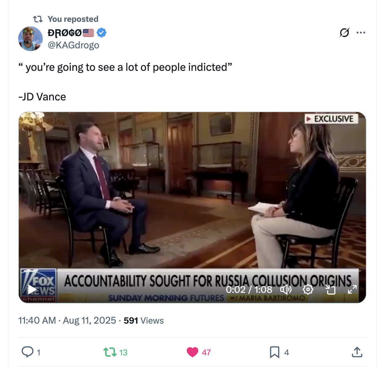 Here's JD Vance with Maria Bartiromo, saying "You're going to see a lot of people indicted."