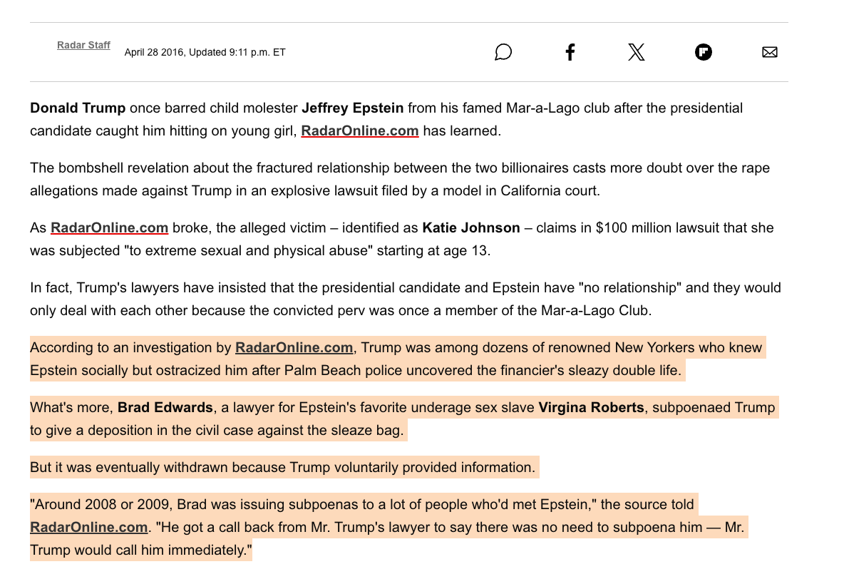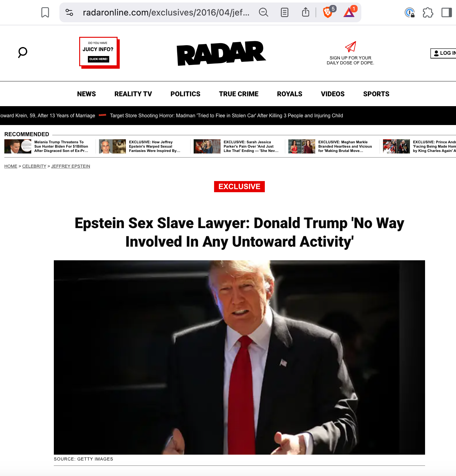 It was actually this Radar Online article that I read back in 2016 that convinced me to vote for Trump: Epstein Sex Slave Lawyer: Donald Trump 'No Way Involved in Any Untoward Activity.'