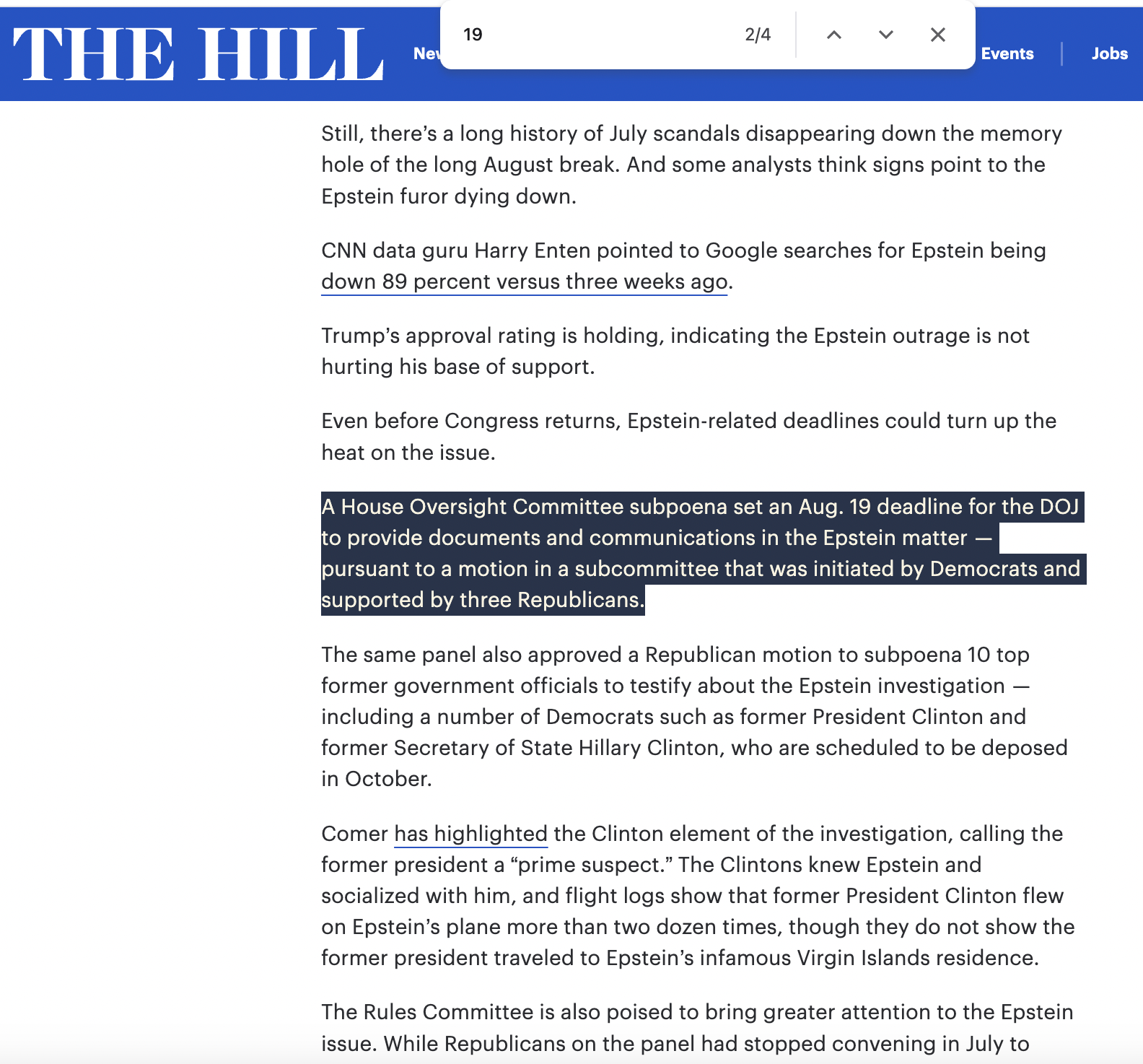 In addition to the subpoenas, a demand was issued for the Department of Justice to release all Epstein-related records by August 19, 2025.