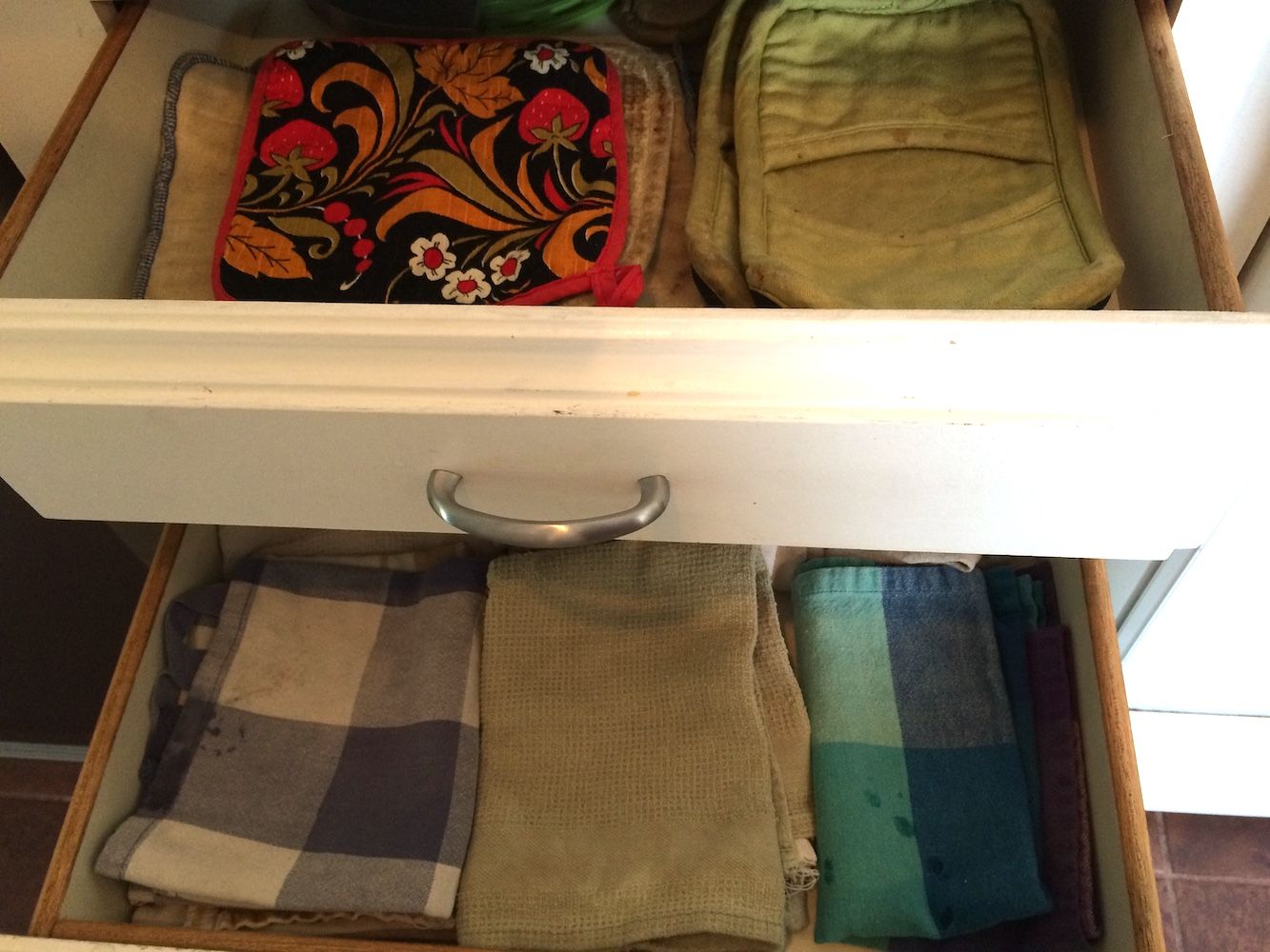 For example, I stored my dish towels in a drawer just to the right of the dishwasher. They are within easy reach for drying dishes, and I like to hang one on the dishwasher handle. I don’t like using lots of paper towels, so I always like to have a dish towel handy to wipe my hands.