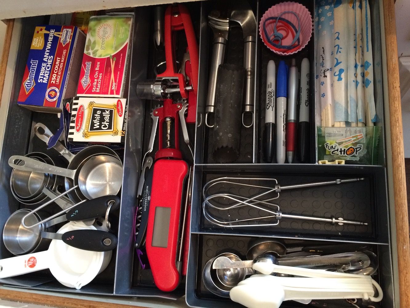 (1) a garlic press and garlic peeler (2) wine and bottle openers (3) chopsticks and chopstick holders (4) thermometers (5) chalk (for my meal plan chalk board) and matches (6) hand mixer beaters, a cherry pitter, a turkey injector, a chip clip (7) VacuVin for wine and stoppers (8) cake decorating tools, silicone muffin molds and rubber bands.