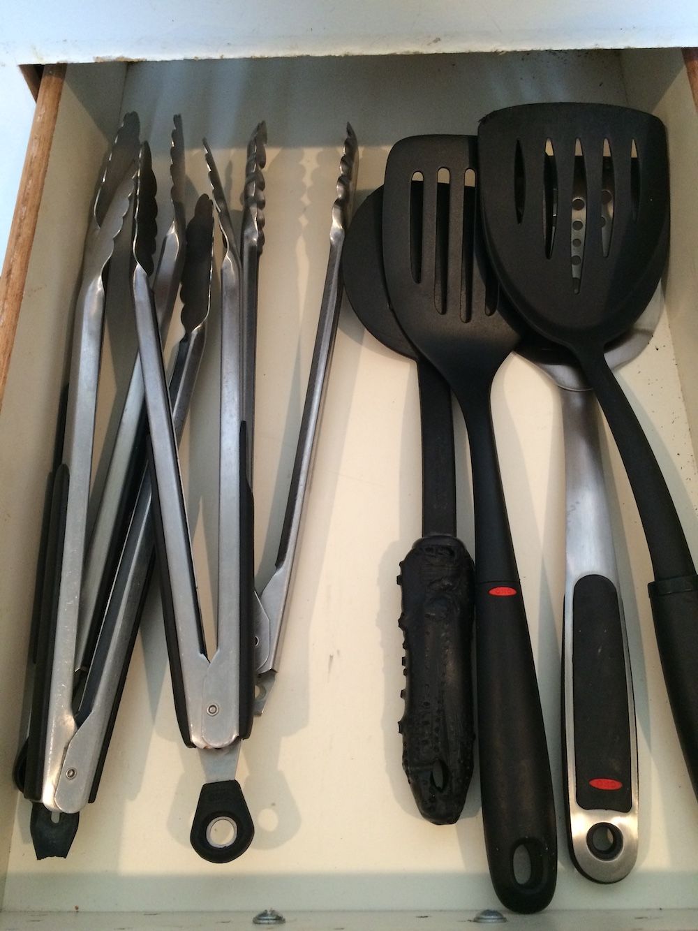 The ONLY thing allowed in this drawer is spatulas (to the left, facing down)) and tongs (to the right). Nothing else.