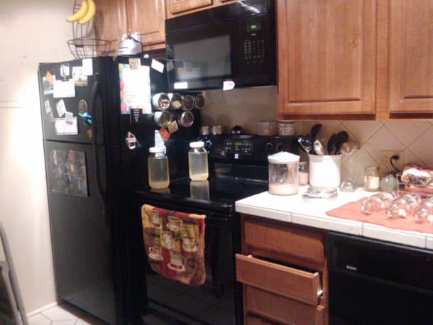 “You can see the length of my kitchen here. Closest to the camera are my two easy-sprouter containers with two different seed mixes (we’re about to go on a week trip to Idaho so I’m bringing my own sprouts with me!), and then next to it to the right are two jars of Kombucha with peaches and ginger floating inside. I’ll strain out the fruit tomorrow. In the distance you can see my sourdough starter that was just fed and then furthest off, two 1/2 gallon mason jars of water kefir brewing.”