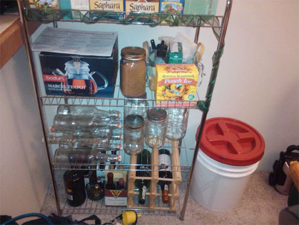 “This was once a rack full of tea. Now it has some pre-mixed tea left, but for the most part I make my own tea blends with herbs from scratch (I’m in love with my chai recipe). I’ve started using it to store extra Grosch bottles, mason jars, and to the right you’ll see one of my many 5 gallon buckets (color-coded of course) with bulk food storage. This one has pink Himalayan salt in it. I also have some natural flour and bread flour ones hidden behind some comfy chairs in my living room… always a wonderful conversation piece!”
