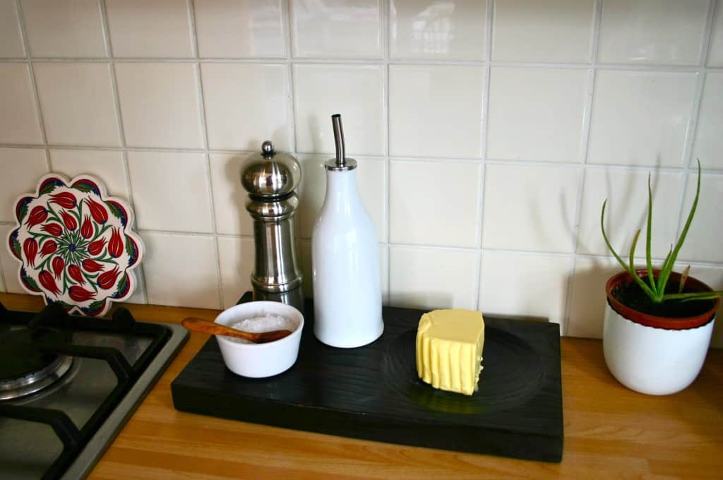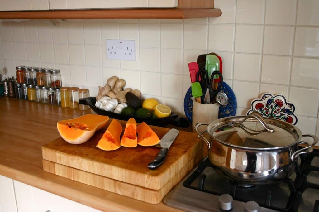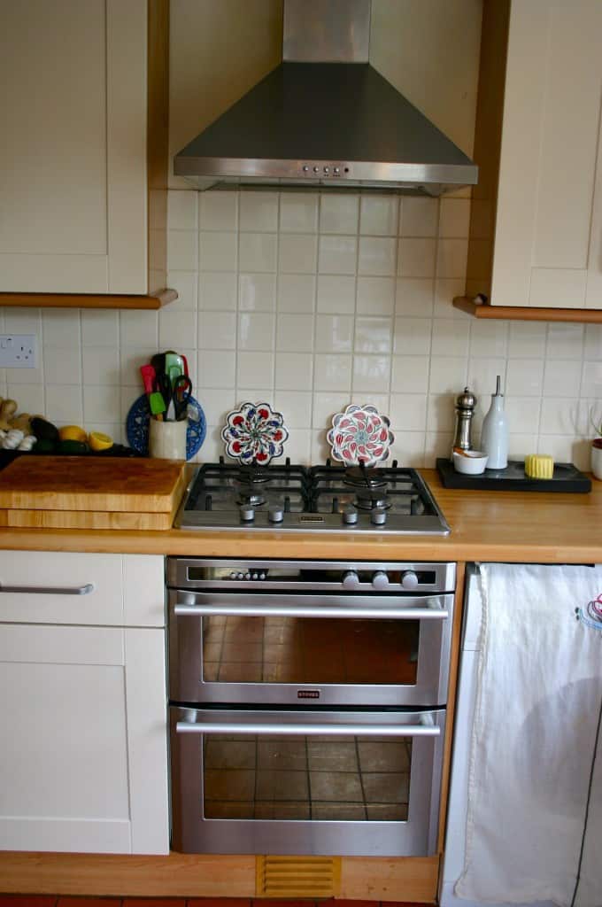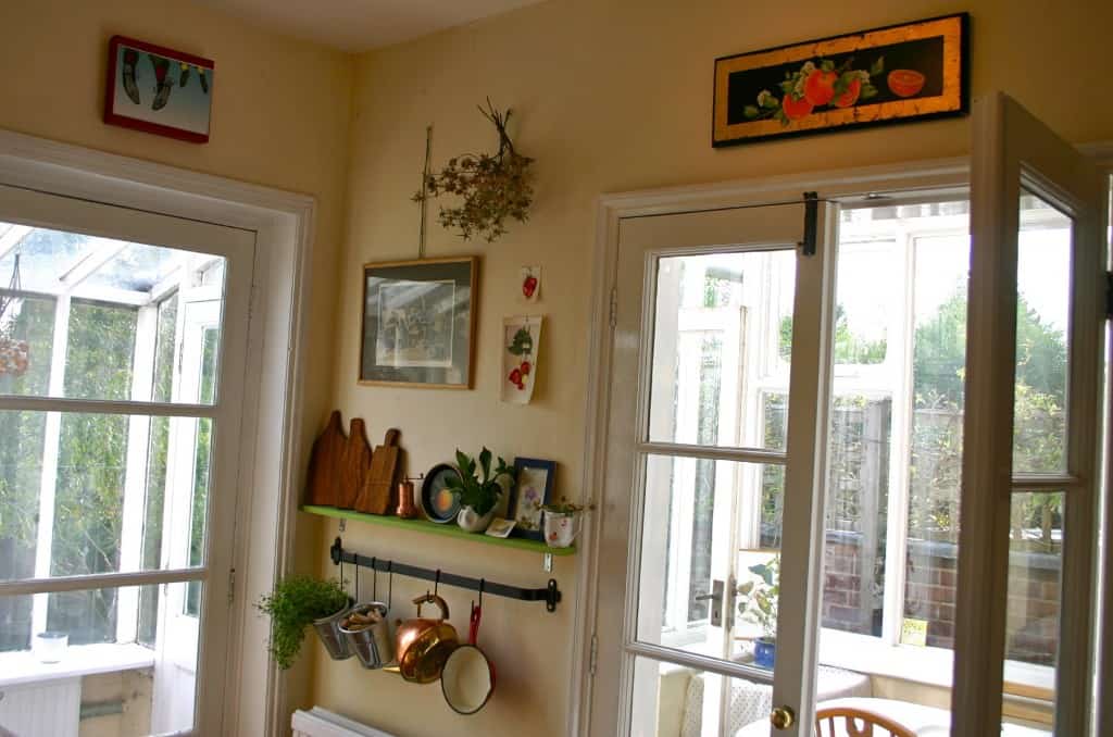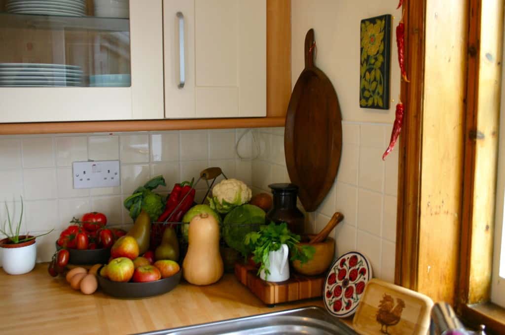 Things You Love About Your Kitchen: As I mentioned just now– there is plenty of storage space, and enough counter space to work on. I can keep my ferments and kombucha tucked away in my cupboards, so it all looks nice and tidy! I love that the flooring is terracotta tile, which has such a natural look and feel, and manages to look relatively clean through plenty of use. There is a window over the kitchen sink facing out to our garden, and french doors lead into a conservatory on one side, letting in lots of light, and making it easy to eat in there when it’s warm enough.