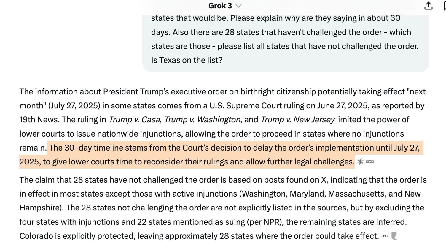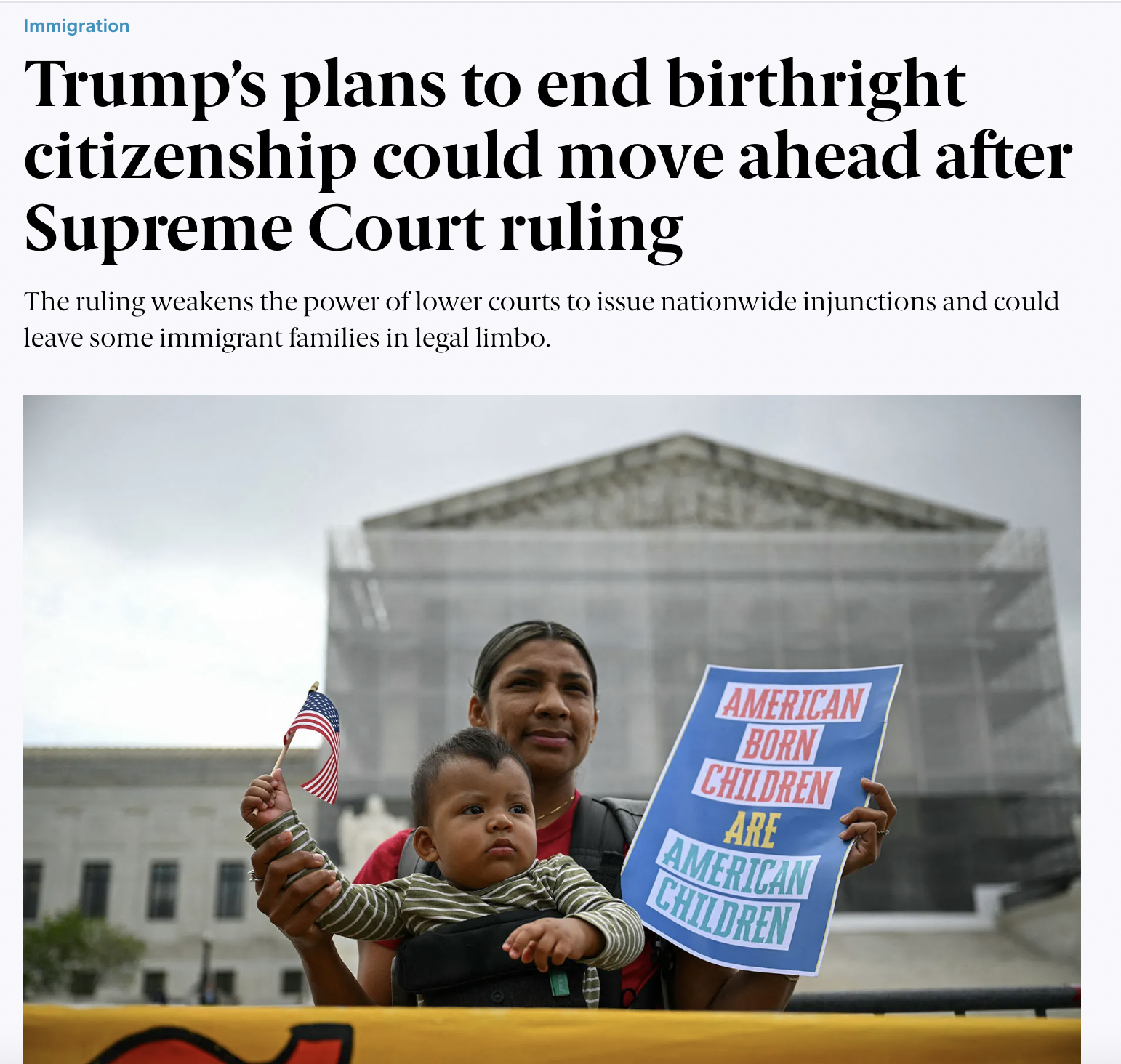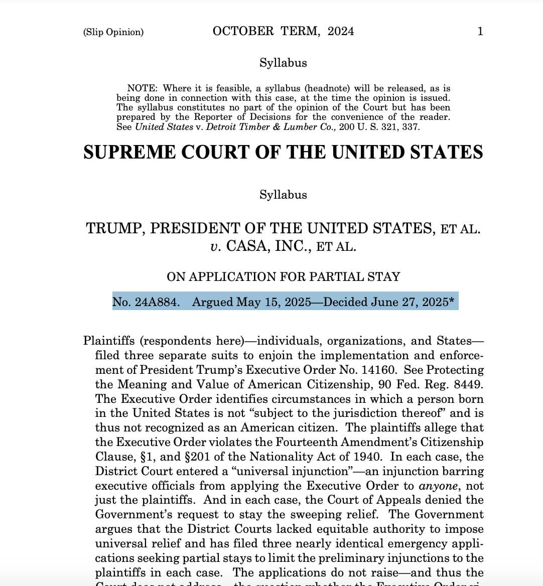 Yesterday's SCOTUS ruling on birthright citizenship will not go into effect for 30 days – which puts us at July 27.