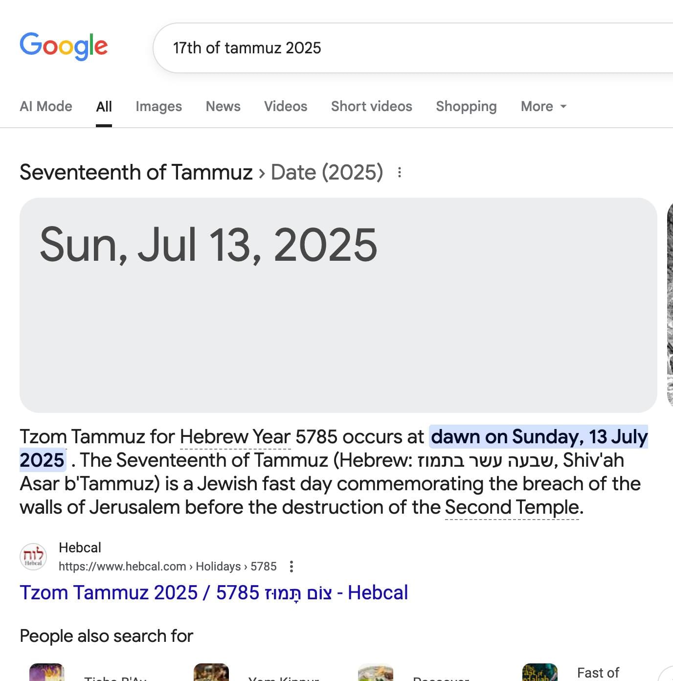 Also, I think something big – a major plot point – will happen on July 13, which this year is the date of 17 Tammuz, the beginning of the Three Weeks which leads up to Tisha B'Av.