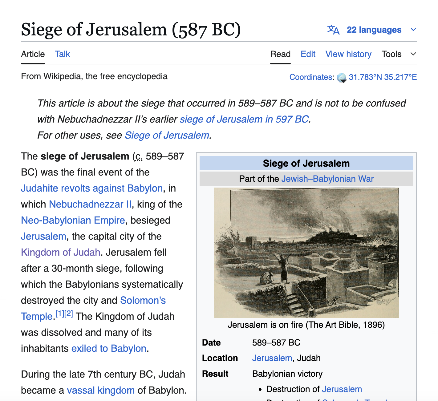 First, of course, there is the Temple in Jerusalem, which was destroyed twice. The first time in 587 BC by King Nebuchadnezzar II of Babylon: