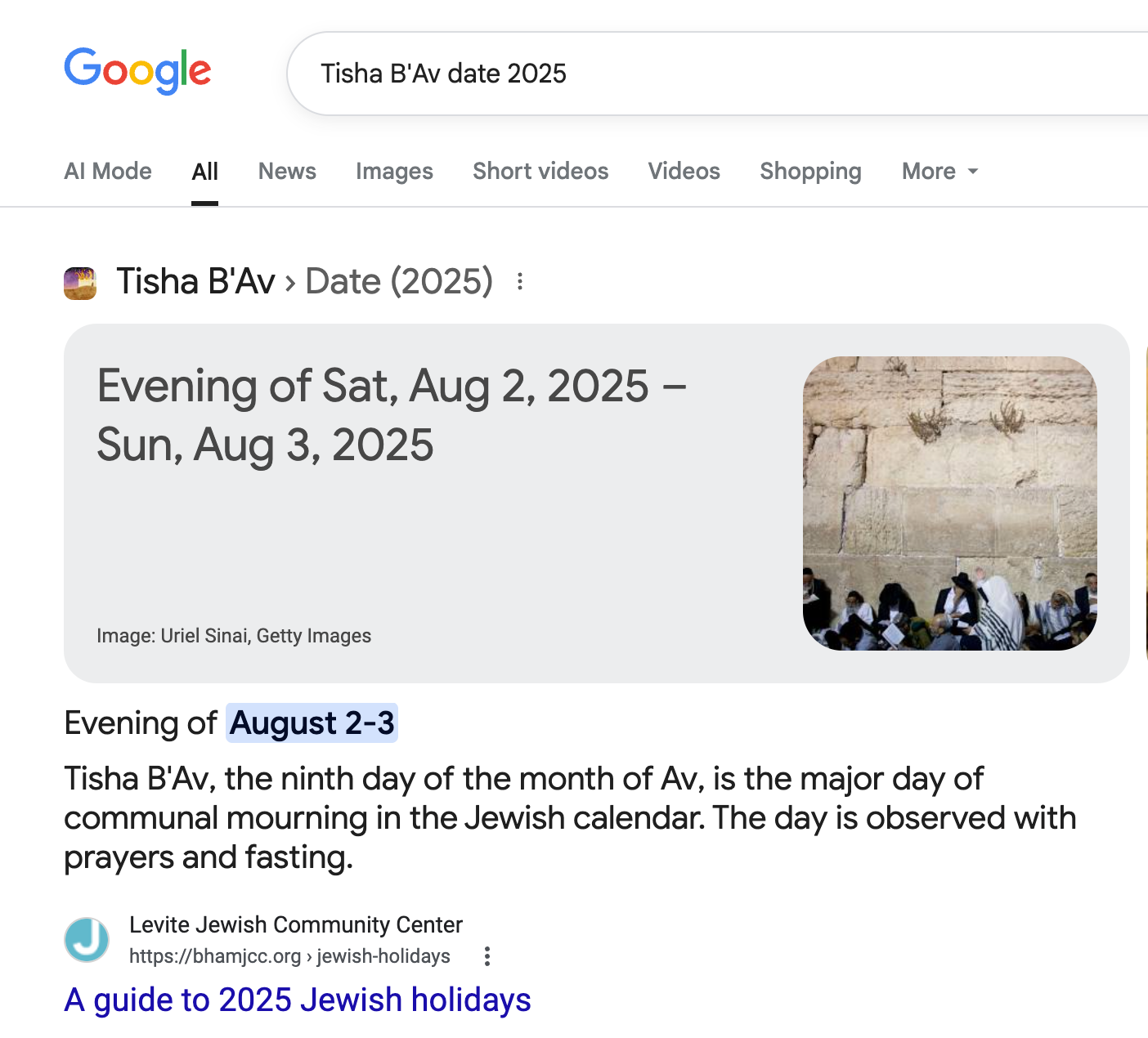 This year, in 2025, Tisha B'Av falls on the evening of August 2nd and ends the evening of August 3rd.