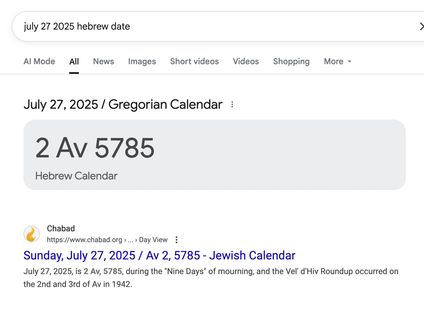 This year July 27 is the Hebrew date, 2 Av, which is the second day of Av.