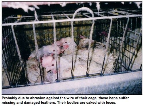 Hens with broken, damaged, and feces-covered feathers packed into tiny wire battery cages so small they cannot even spread their wings.