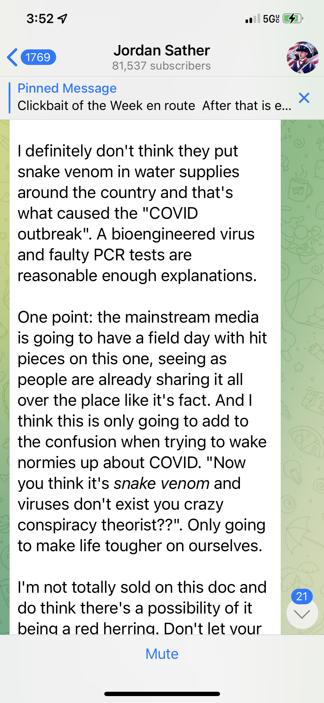 Anyway, I went to her Telegram channel to see if she was saying anything about it. She hasn't said anything about the mask case (probably inundated by the press right now)... but that's when I saw that she had posted about the snake venom.