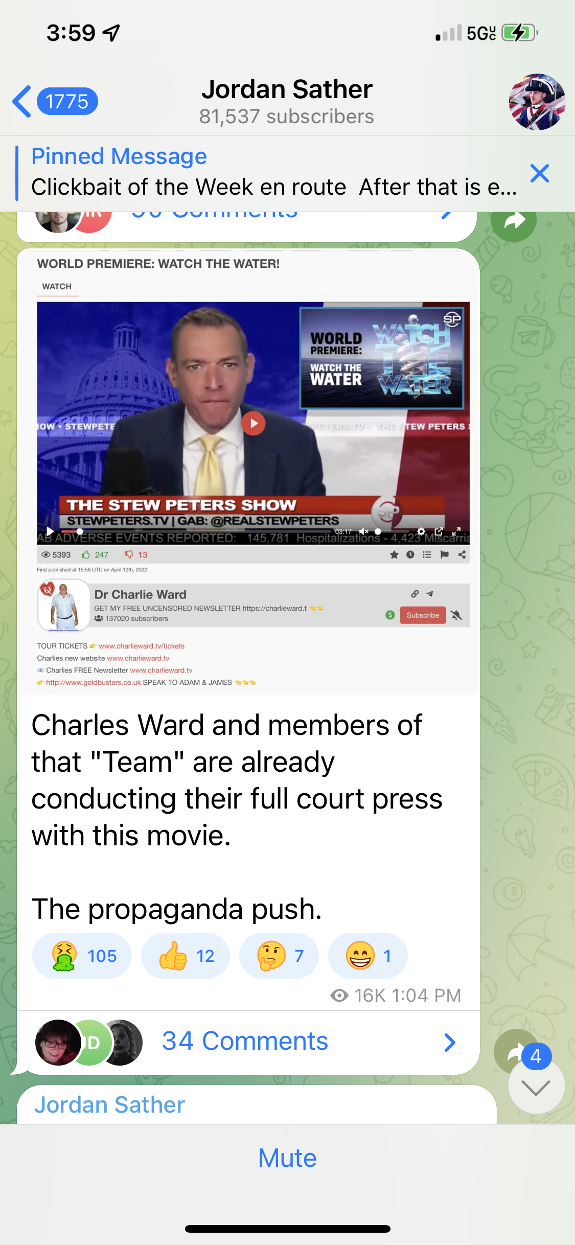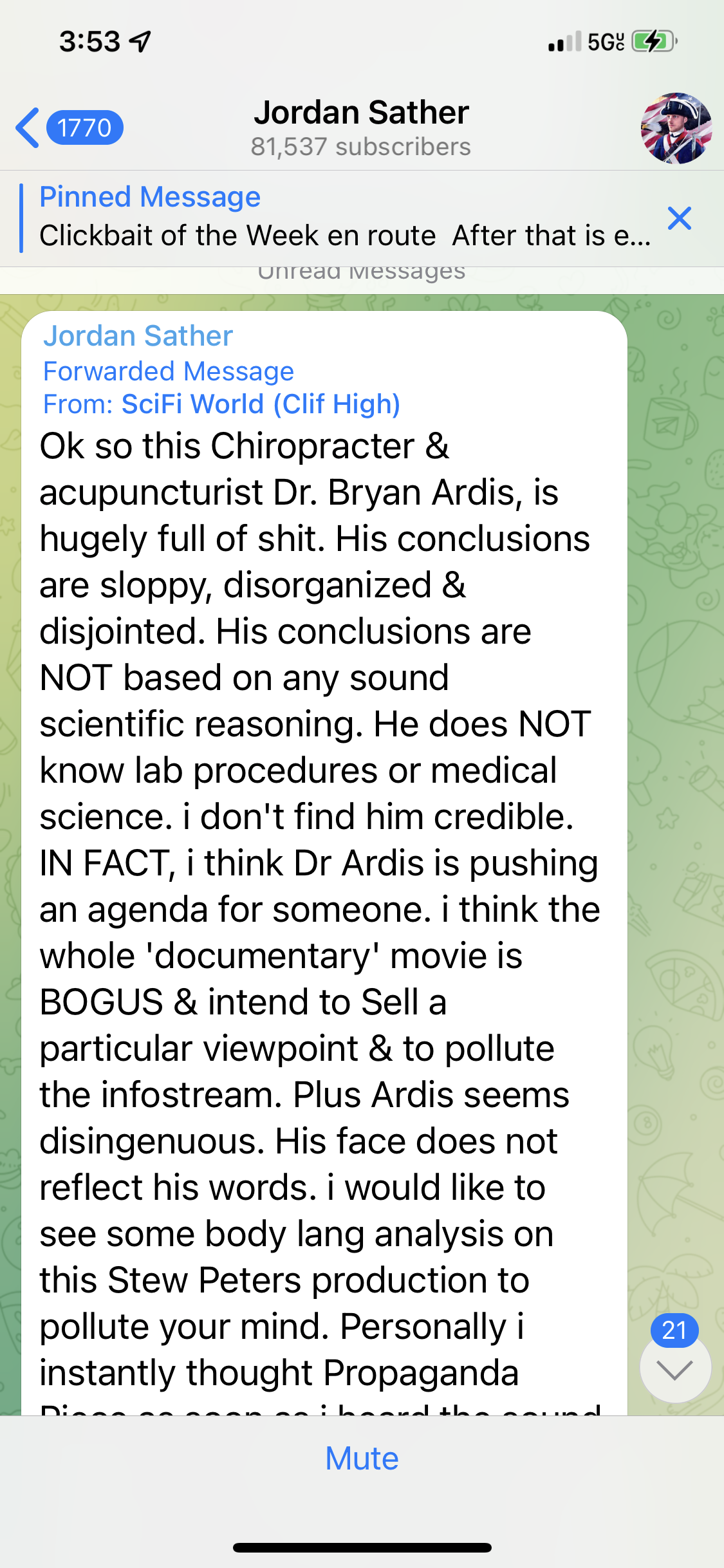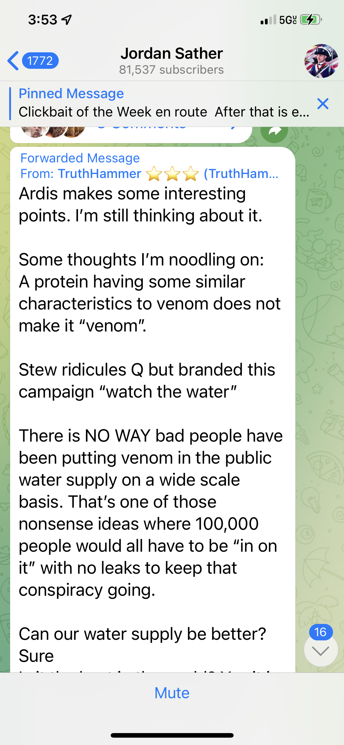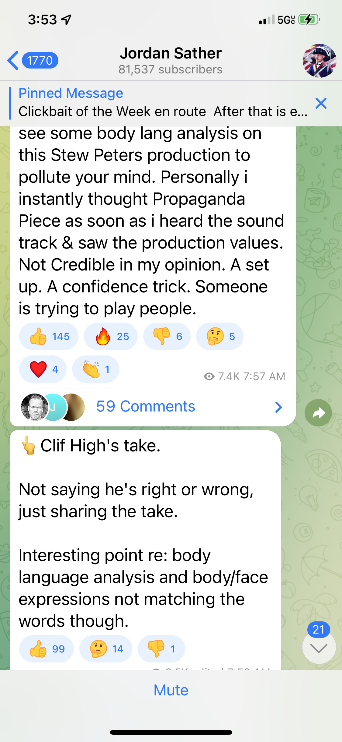Here are some of his posts on Telegram, pushing the psyop narrative, and personally attacking Stew Peters: