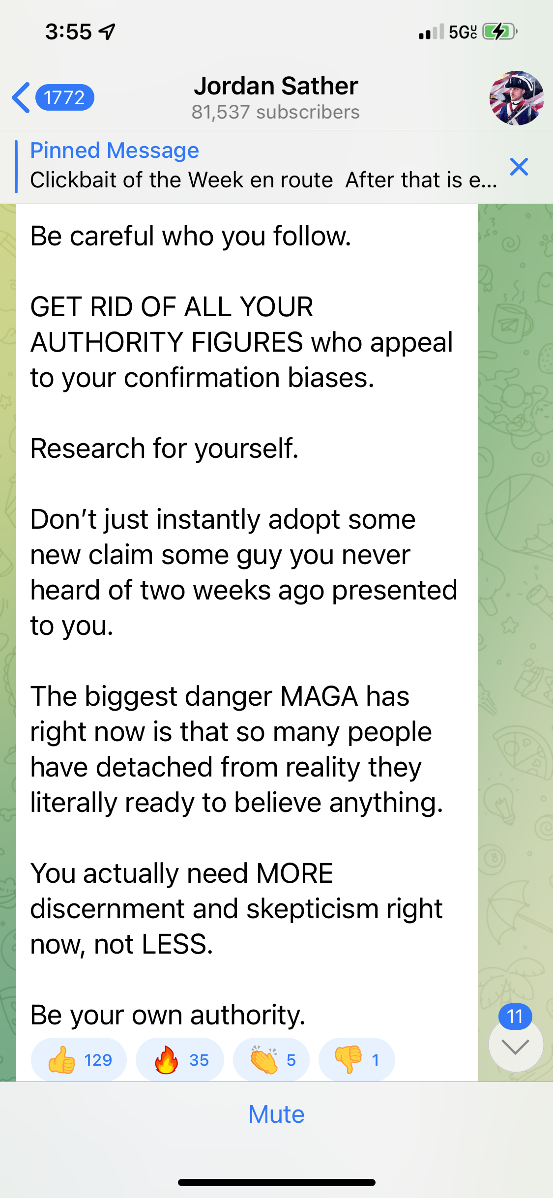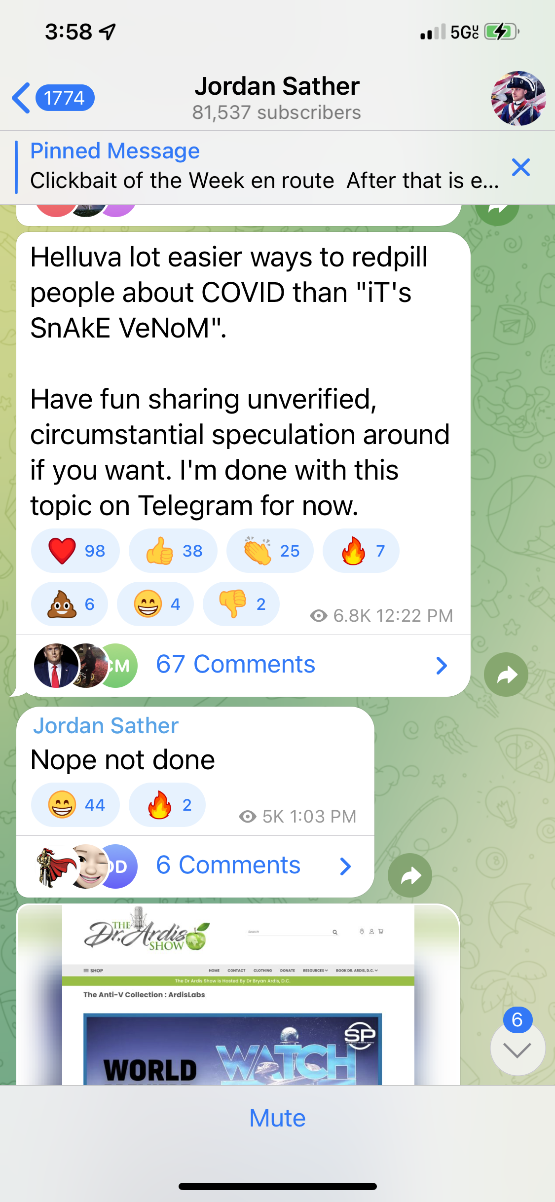 That said, Sarah, you should take that Telegram post down and you should retract what you said and apologize to Stew Peters, Dr. Bryan Ardis, and Lauren Witzke. They are not "con men" and they don't deserve a public attack like that.